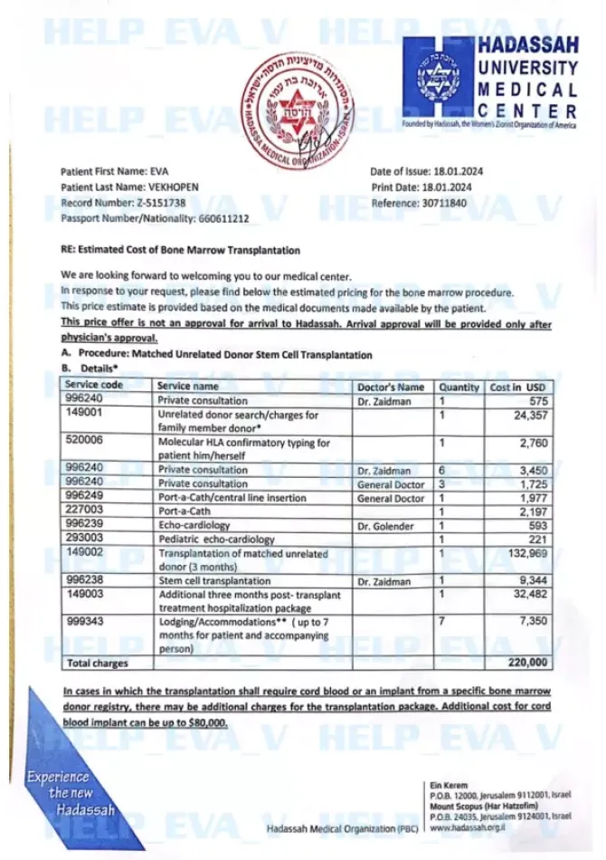Я обращаюсь к Вам с мольбой о помощи - помогите Еве. Может быть, у Вас есть знакомые, которые могут стать донорами или распространить эту информацию среди своих знакомых. Каждая помощь и каждая маленькая поддержка могут сделать огромную разницу в жизни Евы.