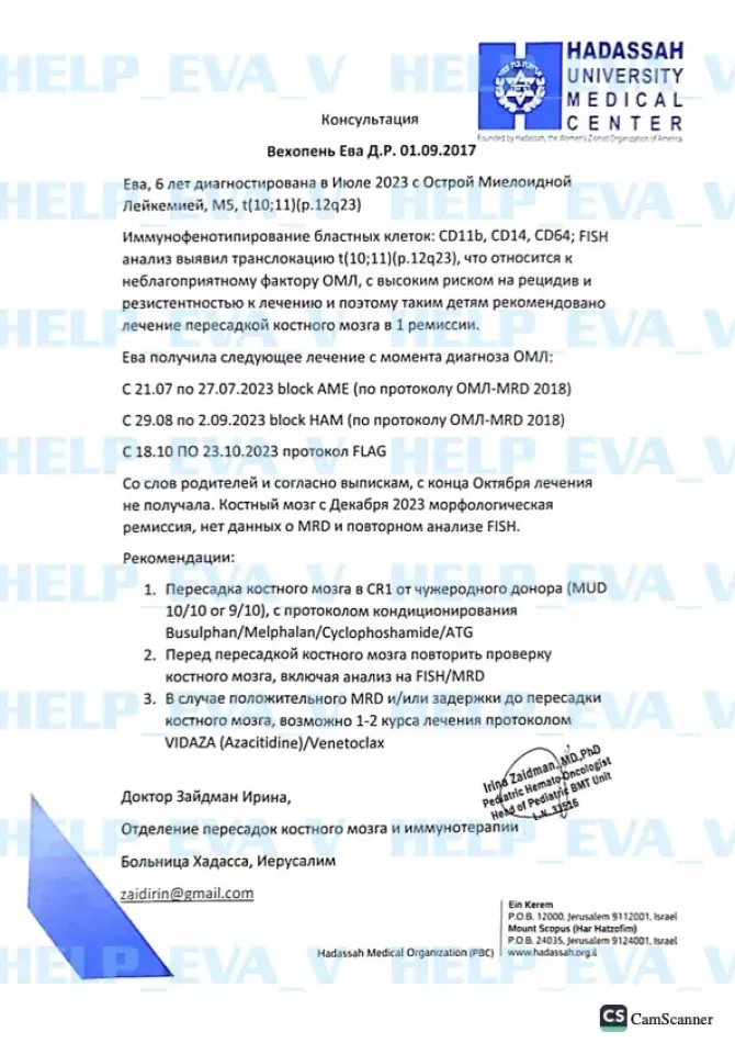 Но борьба становится все серьезнее. Уровень гемоглобина Евы падает до критической точки, и ей срочно нужно переливание крови. Мы ищем подходящего донора с 100% совместимостью, но пока не находим его ни в России, ни за рубежом.