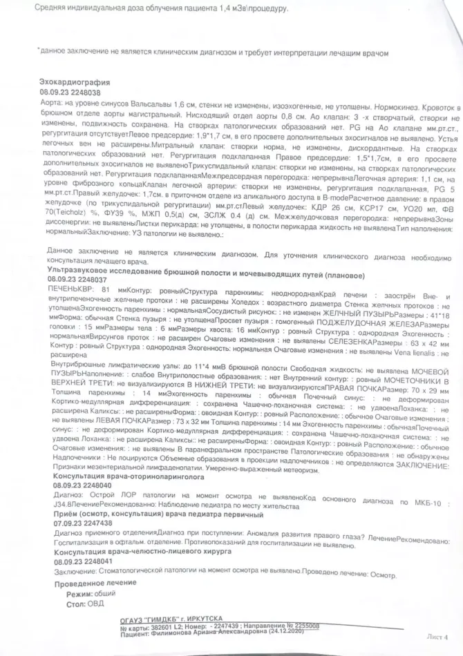 Нашей доченьке всего 3 годика. 6 сентября Ариана играла дома вечером, посмотрела на свет, я увидела как глаз засветился, как у кошки, меня это насторожило и 7 сентября мы поехали в Иркутскую Городскую Ивано-Матренинскую детскую клиническую больницу. Там нас обследовали и госпитализировали, вечером сделали КТ под наркозом и поставили диагноз-односторонняя ретинобластома правого глаза.