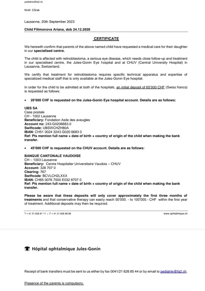 На удаление мы не согласны и нашли клинику в Швейцарии, они ответили, что есть шансы и отправили счет из клиники. Мы проходим лечение в Швейцарии г. Лозанна. Ариана получает химию, уже сделали 2 укола в глаз, и 2 интраартериальные химии (1 интраартериальная химия стоит 1млн 200 тыс. руб. ) Впереди еще предстоит дорогостоящая операция. На сегодняшний день у нашей семьи больше нет средств на лечение дочки . Помогите пожалуйста .Нам больше не к кому обратиться. На вас последняя надежда !