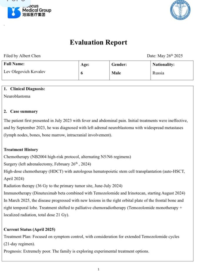 Диагноз: Нейробластома левого надпочечника у Льва. Болеет с июля 2023, лечение в ЛНР и НМИЦ им. Блохина. После трех месяцев метрономной терапии обнаружено прогрессирование. Из-за исчерпания куративных опций показана симптоматическая терапия.