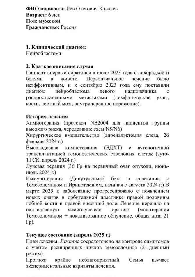 История: Лев родился 10 августа 2017 года, рос любознательным и активным. Диагноз поставлен в марте 2025 года. Прошли несколько курсов лечения, но без успеха.