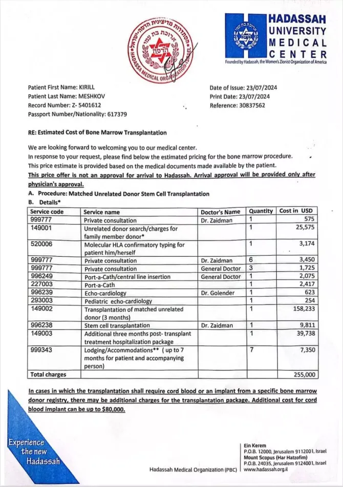 В первых числах марта 2024 г у Кирюши появились красные высыпания по всему телу. И уже 3 марта мы обратились в детскую больницу г.Усолье- Сибирское. Там мы пробыли 3 дня. Нам провели обследование, взяли кровь на анализы. По результатам анализов нам сказали, что у нас какие- то отклонения в крови. УЗИ показало увеличение печени и селезёнки. На 4 день начала повышаться температура, появился жидкий стул. Нас перевели в Инфекционную больницу, где нас исследовали на все вирусы и инфекции. Результаты - отрицательные. После этого нас направили в г.Ирутск в детскую областную больницу в отделение гематологии. И тут нам ставят страшный диагноз - Острый лимфобластный лейкоз Т- IV. Когда мы узнали про диагноз, такое чувство как будто меня ошпарили кипятком. Первый день в больнице я плохо помню, он был на автомате. Что мне говорили, то я и делала, даже не осознавая этого. Во второй день пришло осознание, что слезами горю не поможешь и необходимо действовать. Взяла себя в руки, сжала кулаки, стиснула зубы и вперёд! Врачи сказали, что лечение долгое и сложное. Нам начали гормональную терапию. Гормоны меняют детей до неузнаваемости. Это частая смена настроения, истерики, капризы.. Все бы ничего, но к сожалению, первый курс химиотерапии нам не помог и нас перевели в группу высокого риска. После этого нам дают направление в Федеральный центр г.Москва. 2 мая мы были в детской больнице в Москве. Здесь нам проводят ещё один курс уже высокодозной химиотерапии. Но и он не дал желаемого результата. В клинике нам предложили ещё один блок терапии, включающий в себя курс химиотерапии с 2- мя экспериментальным препаратами, которые применялись детям в единичных случаях, но давали хорошие результаты и выводили детей в ремиссию. В данный момент нам не помогли эти экспериментальные препараты, после двух введений взяли пункцию костного мозга и анализ показал увеличение MRD. Сейчас нам предлагают химиотерапию ФЛАИ, очень высокой концентрации, для того чтобы нас наконец то вывести в ремиссию. Если это случится нас ждёт пересадка в Израиле в клинике Hadassah от неродственного донора. При нашем агрессивном лейкозе даётся один шанс на пересадку. И мы им хотим воспользоваться. Поэтому мы открыли сбор средств, чтоб спасти нашего малыша.