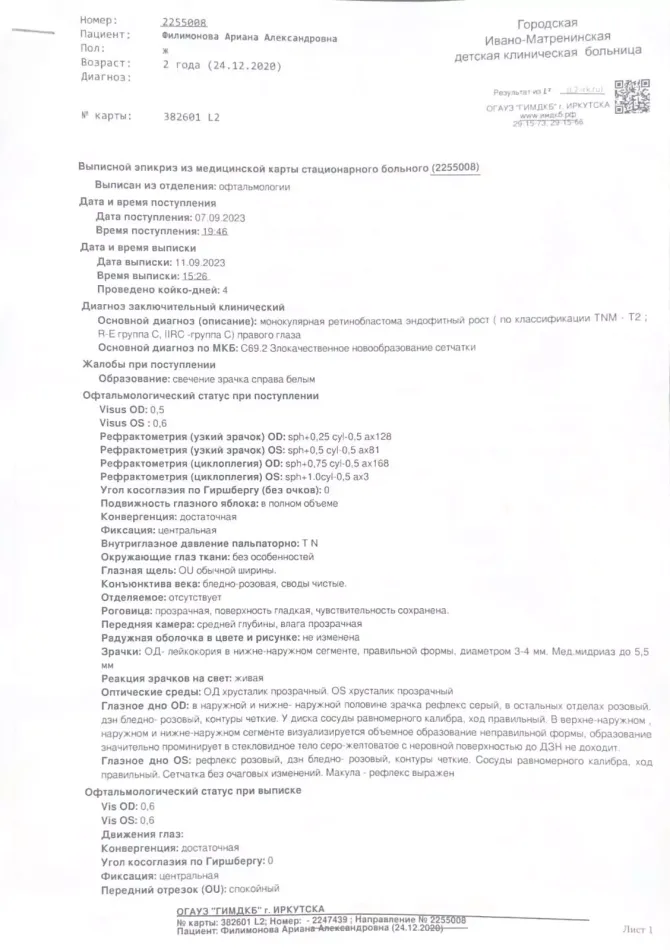 Нашей доченьке всего 3 годика. 6 сентября Ариана играла дома вечером, посмотрела на свет, я увидела как глаз засветился, как у кошки, меня это насторожило и 7 сентября мы поехали в Иркутскую Городскую Ивано-Матренинскую детскую клиническую больницу. Там нас обследовали и госпитализировали, вечером сделали КТ под наркозом и поставили диагноз-односторонняя ретинобластома правого глаза.