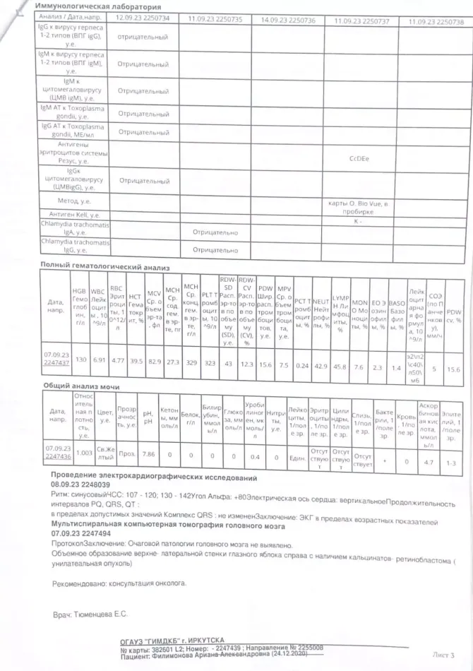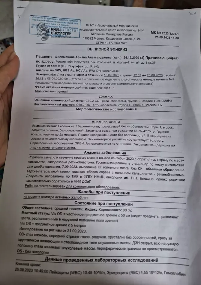 Пролежали там 4 дня , от госпитализации отказались и 11 числа прилетели в больницу ФГБУ "НМИЦ онкологии им. Н.Н. Блохина" Минздрава России. Здесь нам провели 5 дней обследования ,диагноз подтвердили ,за это время правый глаз ослеп , 18 сентября госпитализировали. После всех обследований, мы разговаривали с заведующей офтальмологического отделения ,она сказала ,что будет 2 химии, если не поможет-то будет удаление глаза, потому что на первом месте жизнь ребенка.