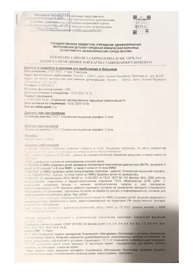 Моей дочери Вязниковой Елизавете в сентябре 2022 года был поставлен диагноз «Спинально-мышечная атрофия».